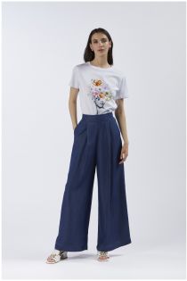 Pantaloni lunghi e ampi con pieghe davanti. realizzati in tencel jeans. tasche laterali. cinturino elastico nella parte posteriore per aumentarne la comodità.