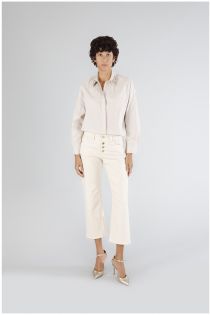 Pantaloni bootcut cropped realizzati in tessuto bull denim stretch. chiusura con bottoniera visibile. capo che si adatta a occasioni casual con t-shirt e scarpe basse.