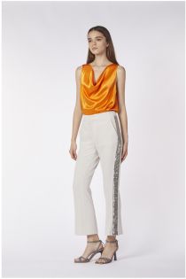 Pantaloni realizzati in un tessuto fluido e ricercata bordatura di pailettes ai fianchi arricchendo e impreziosendo il capo rendendolo così perfetto per una serata speciale.