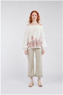 Pantaloni culotte in rasatello di cotone stretch. Una leggera applicazione di passamaneria a perline decora il fondo gamba