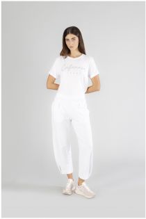 Pantaloni in felpa con piega davanti realizzati in felpa leggera elastica. bottone gioiello su polsino. capo versatile che unisce praticità ed eleganza.