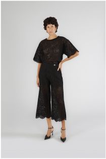 Pantaloni modello palazzo realizzati in tessuto sangallo. modello con zip al fianco e shorts fodera. pantaloni perfetti per un look romantico e versatile.