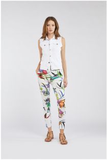 Pantaloni slim realizzati in tessuto di cotone elasticizzato fantasia. Disponibile in 3 varianti di stampa esclusive. La fusione di una modelleria basica e di tessuti originali rende questo capo un vero must have primaverile.