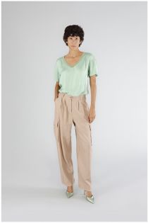 Pantaloni modello cargo realizzato in un fresco tessuto mistolino. simpatica spilla decora il tascone destro