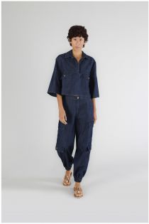 Pantaloni modello tipo cargo con tasconi e fondo elasticato realizzati in tela denim leggera. modello con vita dietro elasticata. chiusura con bottone e zip nascosta. must-have del guardaroba da indossare il giorno con la sua camicia in coordinato.