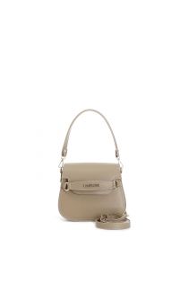 pattina in pelle con tracolla corta, passante con lettering taupe