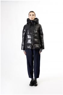 Piumino con cappuccio fisso realizzato in tessuto superlight dalla finitura lucida. fodera con nostro slogan "be noir" in nylon stampata. è presente all'interno una pratica bretella realizzata in nastro jacquard logato che permette di indossare il capo come uno zaino nelle giornate piu calde.