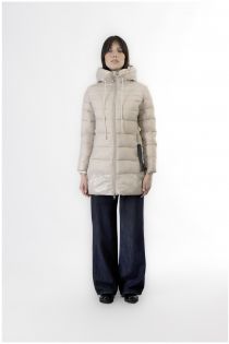 Piumino con cappuccio fisso realizzato in tessuto superlight con contrasti di finiture lucide/opache. lunghezza fino al ginocchio. versatile e pratico capo immancabile nel guardaroba della nuova stagione autunno inverno.