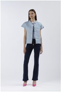 Piumino primaverile con maniche ad aletta realizzato in un nylon impalpabile dalla finitura lucida. trapuntatura orizzontale abbottonatura con bottoni automatici logati.