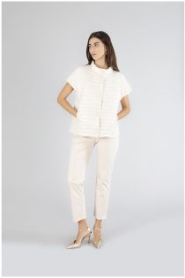 Piumino primaverile con manica ad aletta realizzato in un nylon impalpabile dalla finitura lucida. trapuntatura orizzontale. chiusura con bottoni.