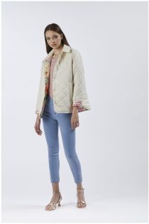 Piumino a maniche lunghe con trapuntatura a rombi realizzato in un nylon impalpabile dalla finitura opaca. il capo è reversibile: da un lato la tinta unita e dall'altro una stampa floreale iconica della collezione estiva