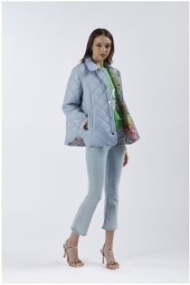 Piumino a maniche lunghe con trapuntatura a rombi realizzato in un nylon impalpabile dalla finitura opaca. il capo è reversibile: da un lato la tinta unita e dall'altro una stampa floreale iconica della collezione estiva