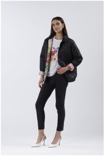 Piumino a maniche lunghe con trapuntatura a rombi realizzato in un nylon impalpabile dalla finitura opaca. il capo è reversibile: da un lato la tinta unita e dall'altro una stampa floreale iconica della collezione estiva