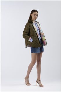Piumino a maniche lunghe con trapuntatura a rombi realizzato in un nylon impalpabile dalla finitura opaca. il capo è reversibile: da un lato la tinta unita e dall'altro una stampa floreale iconica della collezione estiva