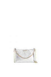 Pochette in pelle laminata con tracollina in catena. chiusura con cerniera.
