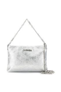 pochette in pelle metallizata, tracolla e manico con catena e moschettoni argento