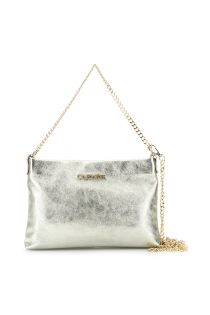 pochette in pelle metallizata, tracolla e manico con catena e moschettoni platino