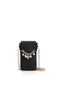 Portacellulare con ciondoli e tracolla con catena dorata.