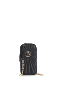 Portacellulare con trapuntatura a raggiera e logo cafènoir in metallo. tracollina in metallo.