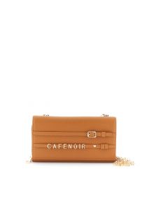 Portafoglio effetto pelle con doppio vano uno con pattina ed uno con zip decorato con strisce con lettering e fibbia. tracollina in catena staccabile.