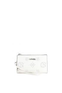 Portafoglio con piega e doppia apertura con zip e baccello pattern logato microforato con laccetto per portare al polso.