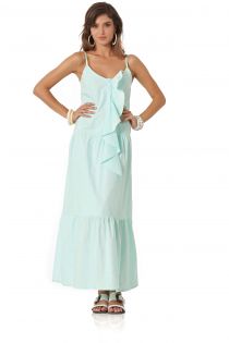 Fresco e pratico abito lungo a balze realizzato in popeline di cotone tinta unita. Una delicata rouche sul davanti insieme ad una sottile abbottonatura lo rendono iper femminile, mentre le spalline regolabile lo rendono comodo e versatile.