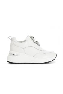 Slip-on da donna in pelle rivestita con riporti effetto laminato con accessorio gioiello a decoro. fussbett interno.