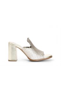 Sabot in pelle intrecciata. fodera e soletto sono in pelle. tacco grosso alto 9 cm.