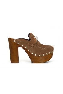 Sabot in pelle scamosciata con tacco alto e plateau in legno. morsetto decorativo ricco di strass.