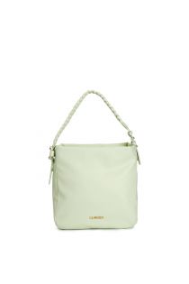 sacca a spalla morbida con tracolla a treccia, accessorio smaltato e fermagli verde