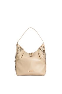 sacca con pieghe, laseratura floreale, rivetti decorativi e manico regolabile tortora