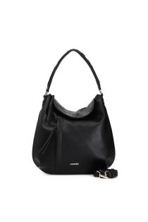 Sacca con tasca verticale frontale con zip. manico con infilatura e tiralampo a treccia. borsa dotata di tracolla.