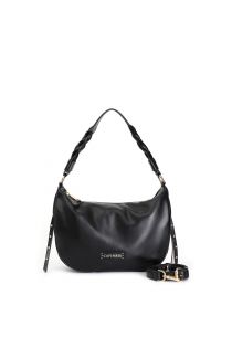 Morbida sacca con tasche laterali tiralampo bicolore decorati con rivetti chiusura con zip manico intrecciato logo su patch in metallo e tracolla removibile.