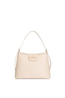 sacca in saffiano con accessorio smaltato e motivo di infilatura metallizzata cipria