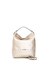 Sacca dal gusto rock con colori metallizzati e file di borchie di diverse dimensioni che creano una fascia decorativa sul fondo
