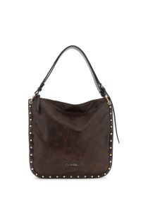 Sacca morbida in similpelle dall'effetto vissuto e sfumato con bordi decorati da rivetti. logo in metallo e tracolla regolabile per uno stile casual e grintoso.