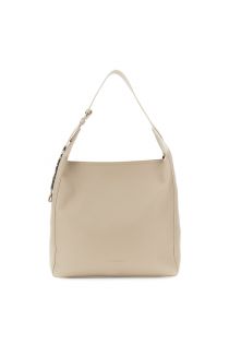 Sacca a spalla in msimilpelle effetto pelle con grana con manico regolabile e maxi lettering in metallo. ampia tasca piatta interna e chiusura pratica.