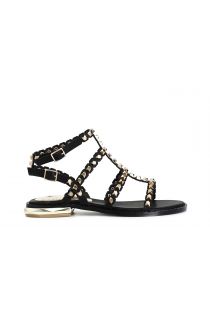 Sandali alla schiava con doppia fibbia decorati con borchie sfaccettate. la forma particolare del tacco rende la calzatura super chic e super glamour. comodo soletto imbottito per una calzata morbida. tacco alto 20mm. comodi da indossare e facili da abbinare.