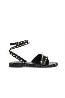 Sandali asimmetrici in pelle con laccino alla schiava e cabochon. fodera e soletto sono in pelle. il tacco è alto 2 cm. comodi da indossare e facili da abbinare.
