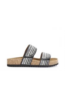 Sandali bassi modello ciabatta con fondo in sughero e fasce regolabili decorate da strass degradè. un incrocio fra lo stile boho e etnico per un'estate all'insegna dello stile