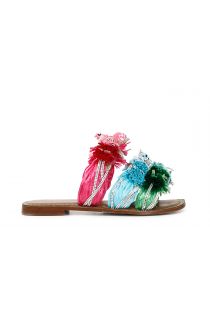 Sandali chiusi dietro con fascia di strass e rafia intrecciata , suola in cuoio e guardolo con borchiette. Soletto e fodera in pelle.