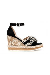 Sandali chiusi dietro in camoscio e rafia sfrangiata multicolor con accessorio strass e perline in legno su zeppa multimateriale.