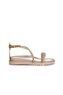 Sandali incrociati con strass costruiti da una fascia piatta e da un incorcio sul collo del piede che si chiude con un cinturino.