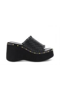 Sandali modello ciabatta in pelle con listini intrecciati e zeppa rivestita. fodera e soletto in pelle per un comfort superiore. tacco alto 9 cm e plateau di 4.5 cm. calzatura ideale per look estivi dallo stile moderno e chic.