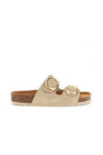 Sandali modello ciabatta con doppia fascia in morbida pelle scamosciata impreziosite da maxi fibbie tonde dorate. il plantare anatomico garantisce comfort e supporto durante tutta la giornata mentre la suola di 3 cm in sughero e gomma assicura leggerezza e stabilità. perfette per un look casual ricercato.