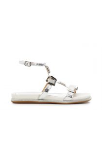 Sandali con accessori forma squadrata in metallo in tono con la tomaia. Particolare il guardolo smussato in glitter.
