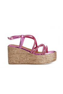 sandali con fasce incrocio strass su zeppa in rafia fuxia