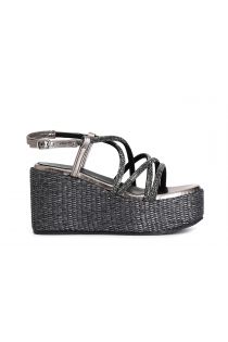 Sandali con fasce in strass incrociati e cinturino con fibbia alla caviglia. zeppa fasciata in rafia.