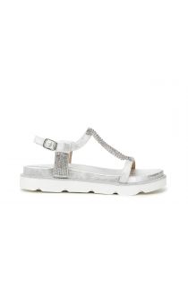 Sandali con tomaia laminata e una preziosa fascia morbida di micro strass che cinge il fronte del piede. Cinturino alla caviglia.