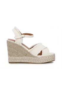 Sandali con incrocio in tessuto sfrangiato su zeppa corda h90mm